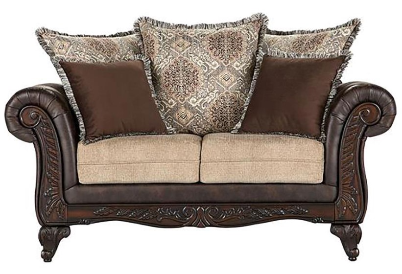 Seat cushions feature light brown, while back pillows are patterned in complementary hues, offering refined flair for your sitting area. A pair of accent pillows complete the plush look, complete with fringe trim that mirrors the back pillows. The front and arms are further augmented with carved details, offering a loveseat that ensures a rich, refined ambiance.