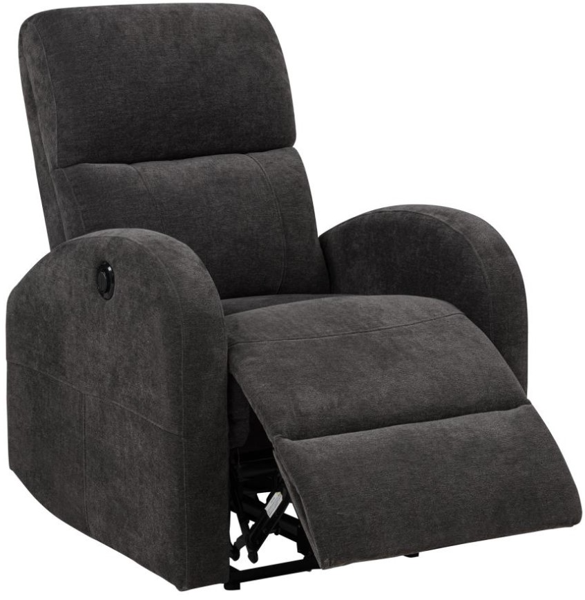 Power recliner in charcoal gray fabric blends classic shape with compact modern proportions