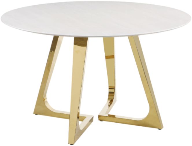 A clean China white top made of genuine marble with engineered marble veneer is slender and sophisticated, perfect for bridging design motifs. Embrace a geometric-inspired gold stainless steel base that becomes a focal point for its brilliance and silhouette. Dress up this chic round table with compatible chairs and accessories that turn your home into a veritable furniture gallery.