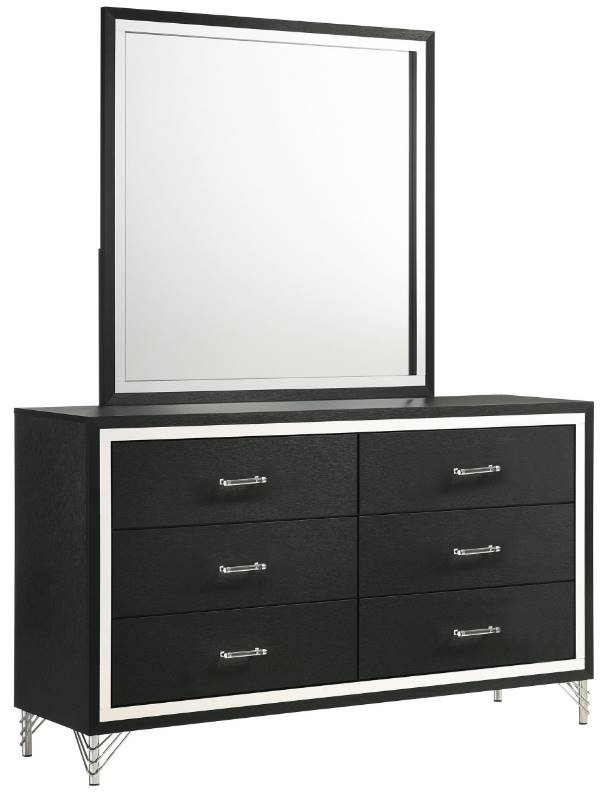 Introduce sophisticated and a hint of glamour with a modern six-drawer dresser and mirror set. Perfect for your stylish bedroom, it offers roomy drawers with smooth interiors perfect for clothing and accessories. The dresser features a bold black finish, with bands of shiny chrome trim and matching hardware and legs.Read More