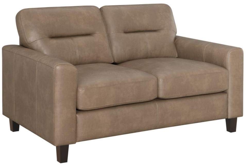 Defined cushions offer medium-firm support with tailored topstitch detail