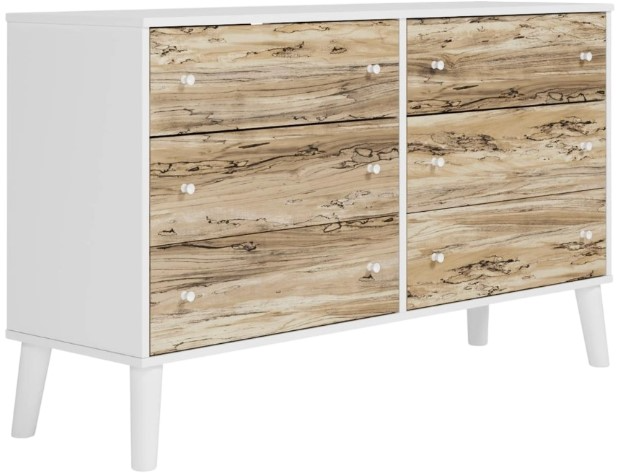 The perfect marriage of contemporary and casual style, this dresser is a charming addition to your home. This dresser is expressive with its two-tone look in a solid matte white finish and a replicated sugarberry wood grain pattern. Ball bearing glides offer smooth opening and closing of the drawers, while white knobs and splay legs add a finishing touch.Read More