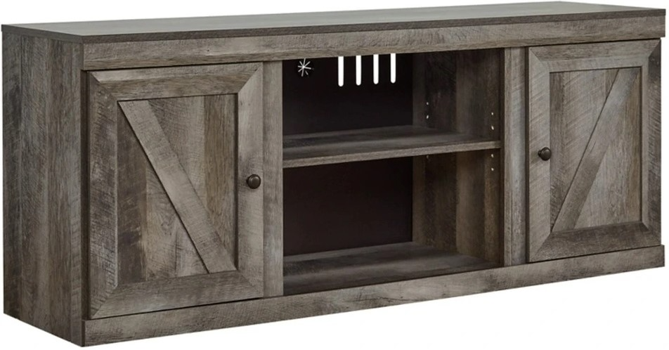 This TV stand is sure to win your heart with its daring take on country living. Its crisp, clean minimalist-chic profile is enriched with a gray finish, striking replicated oak grain and thick plank styling for that much more authentic character. Crossbuck detailing adds a brilliant barn door-inspired touch. Opt for the optional fireplace insert (sold separately) for added warmth.
